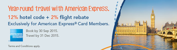 Forget about the short-lived flash sales! American Express Card members will receive 12% off all eligible hotel reservations made on Zuji.com.sg. Payment must be made using an American Express Card issued by American Express International, Inc. in Singapore (this excludes your AMEX cards issued by UOB, DBS and other banks).
