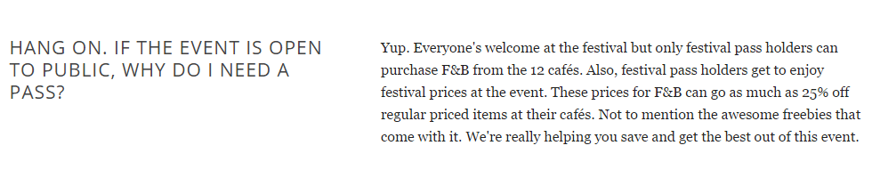 The online FAQ on Café Fest Singapore firmly states that "only festival pass holders can purchase F&B from the 12 cafés. However, this is evidently not the case on the day of event. EVERYONE could purchase from the cafes on the day of event and ticket holders were given a miserable S$0.50 or S$1.00 discount off the public price. Therefore, to break-even, I would have to purchase 30 coffees (since the VIP Tickets were S$30 each). Uh, I don't even drink that much at Oktoberfest.