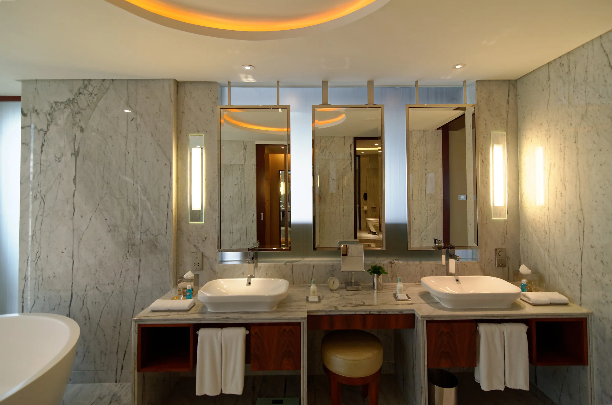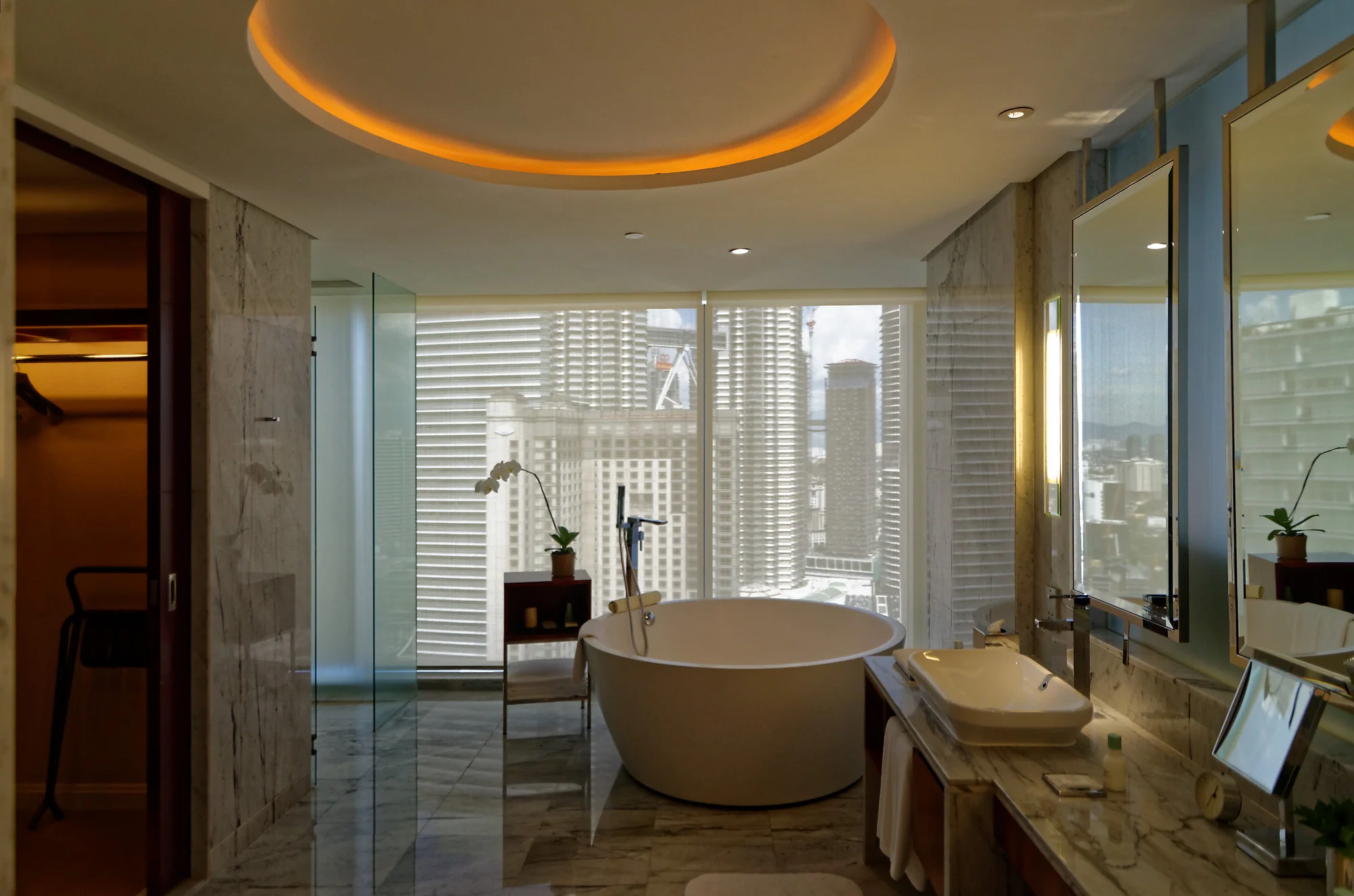 The best part of the Grand Suite has to be the amazing bathroom which has a huge floor to ceiling window that offers expansive views of the surroundings. So if you have taken my advice and have opted for a Grand Suite with a view of the Twin Towers, you would be thanking me right now. That being said, the first thing you realise is probably not the Twin Towers but the ridiculously large circular shaped bathtub which fits two people (at least) comfortably. Hot water comes freely but the tub takes a while to fill up because of its sheer size.