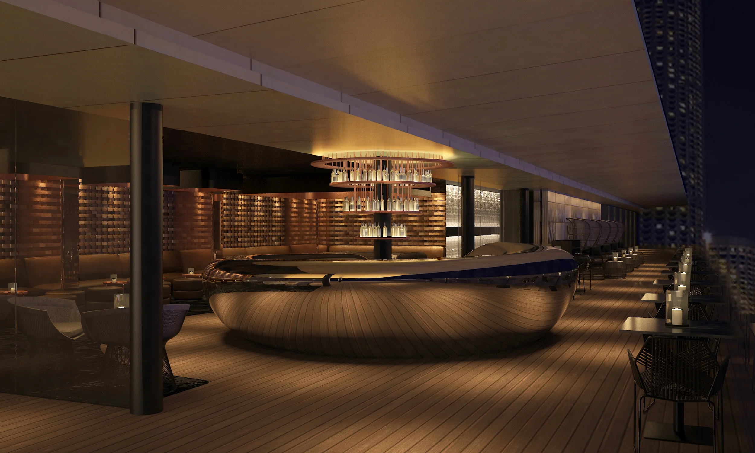 The sculptural bar that anchors the beautiful space is made from high-grade polished mirror stainless steel and it exudes sophistication and urbanity. The indoor lounge area features plenty of woods, copper tones and warm lighting; the bar excludes a magnetic intimacy.