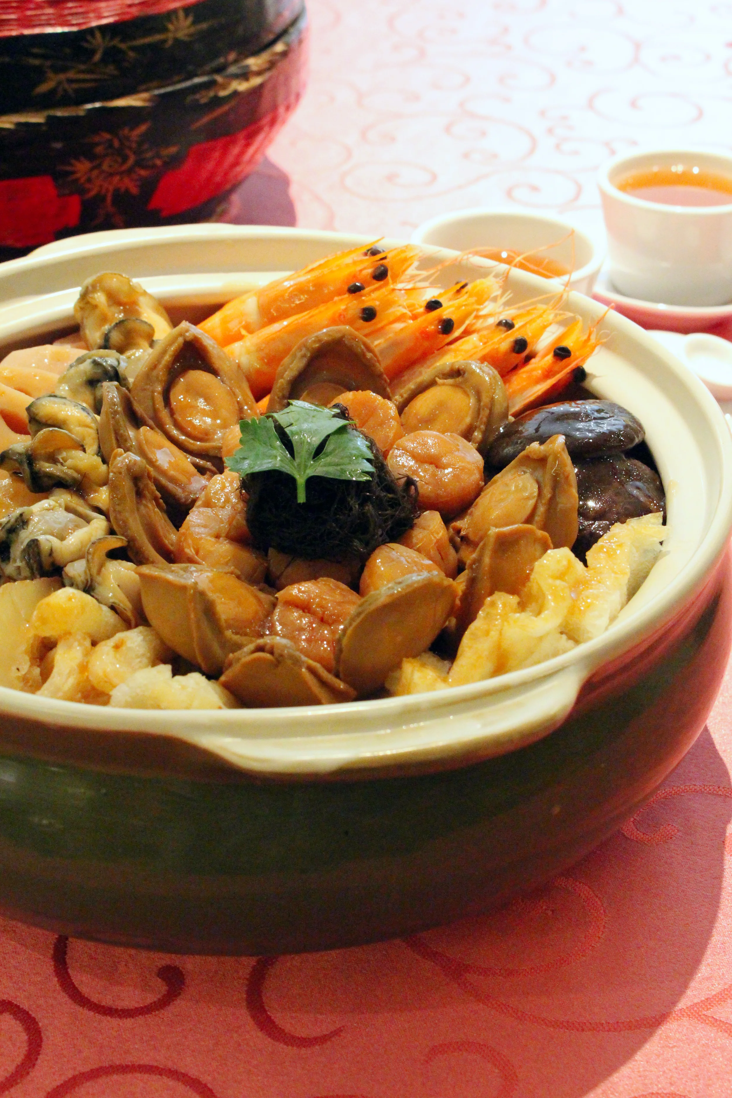 Integral to every Chinese New Year celebration is Yu Sheng (a festive salad for good luck and good fortune) and an over-indulging Pen Cai which consists of premium ingredients (e.g. abalone, scallops, prawns, oysters and mushrooms) which are cooked in a deliciously rich broth. Other signature dishes include the "Buddha Jump Over the Wall" and the Jia Wei Roasted Duck by Master Chef Victor Lee.