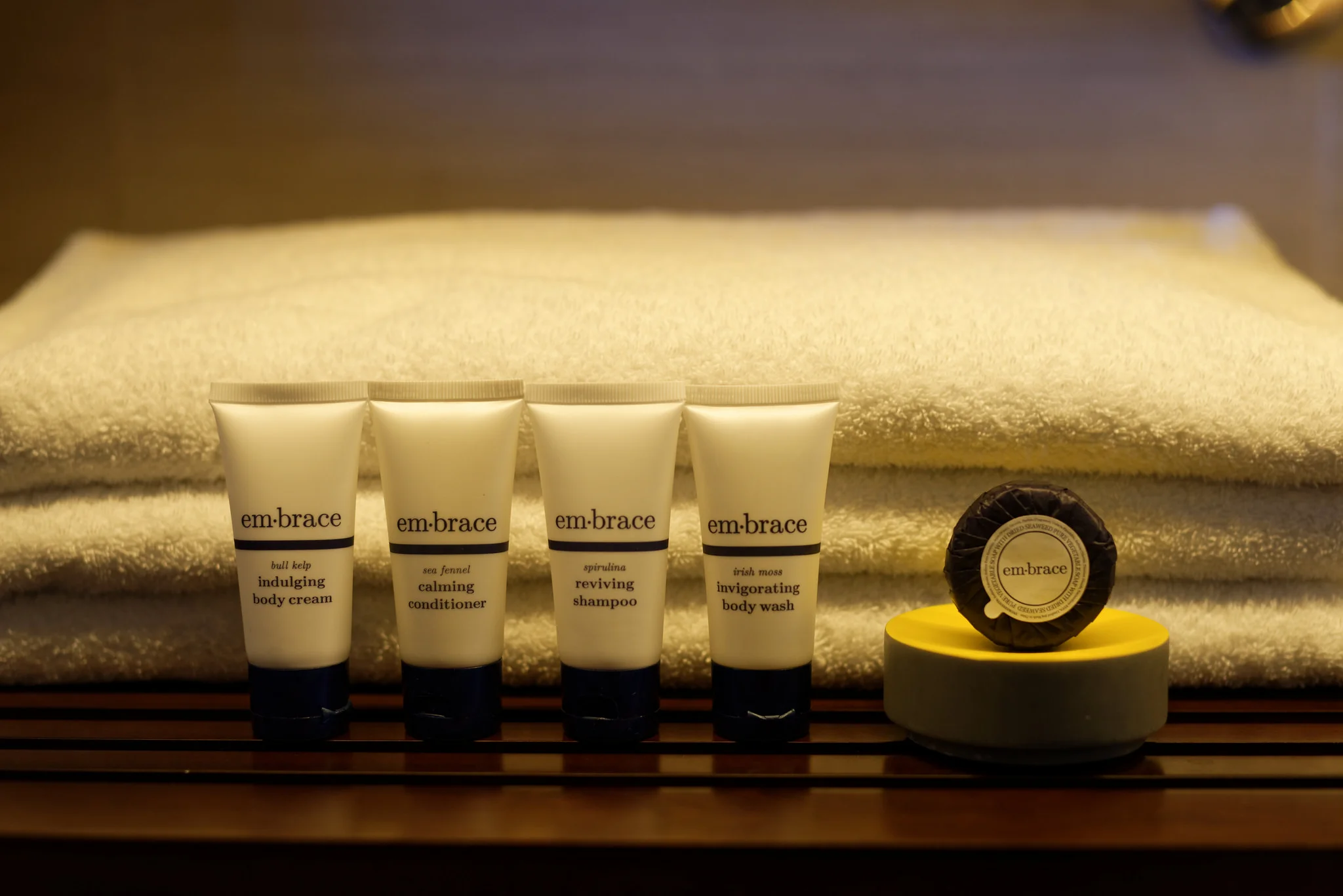 The Harbour Studios (and I do believe the lower-tier rooms as well) at the Pan Pacific Singapore now uses an in-house bathroom amenity instead of the former Elemis brand. Branded as 'em-brace' by the Vanity Group for Pan Pacific Hotels and Resorts, the relatively new bathroom amenity uses a variety of interesting ingredients such as bull kelp, spirulina and sea fennel to create a beautiful symphony of bath products that are a pleasure to use.
