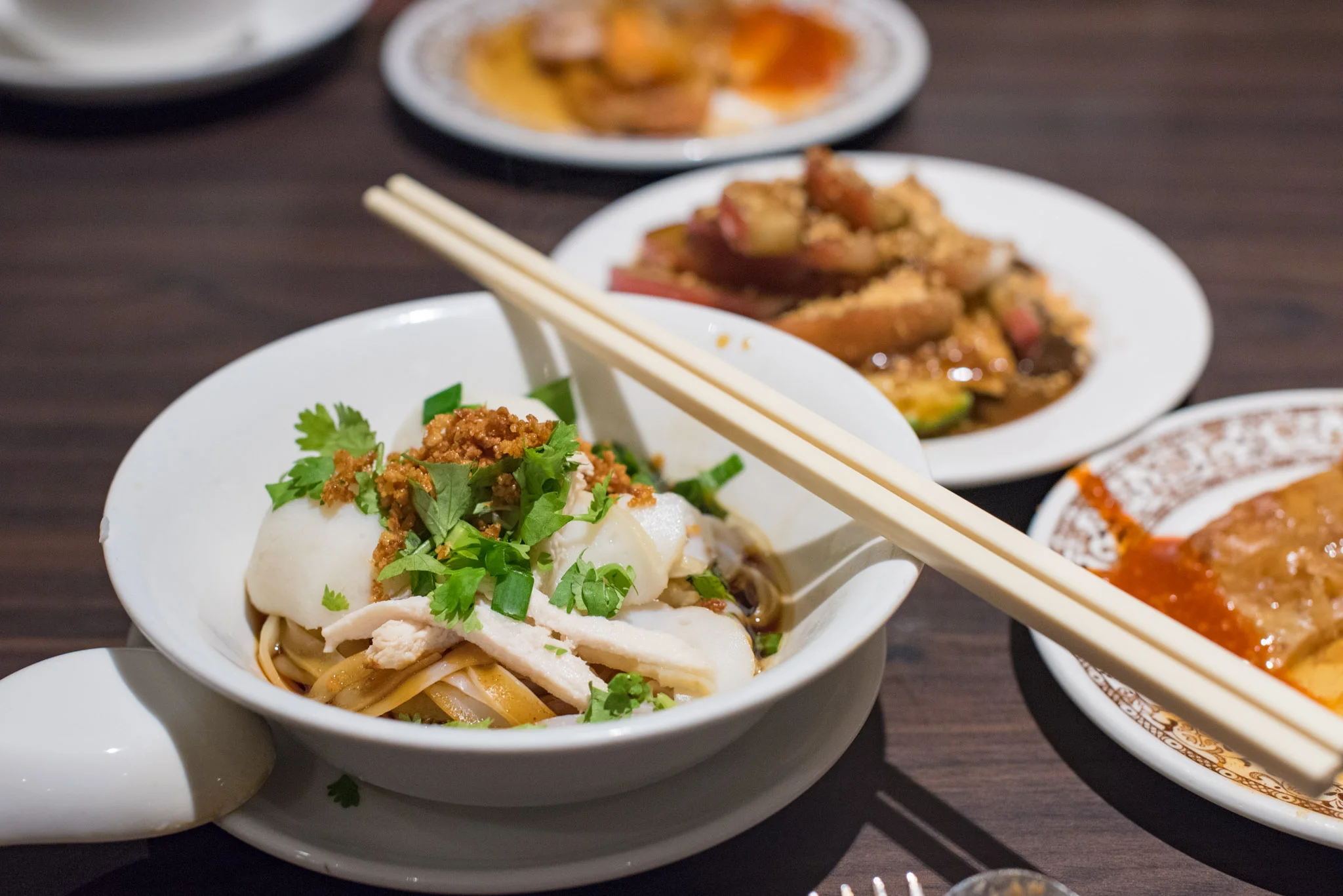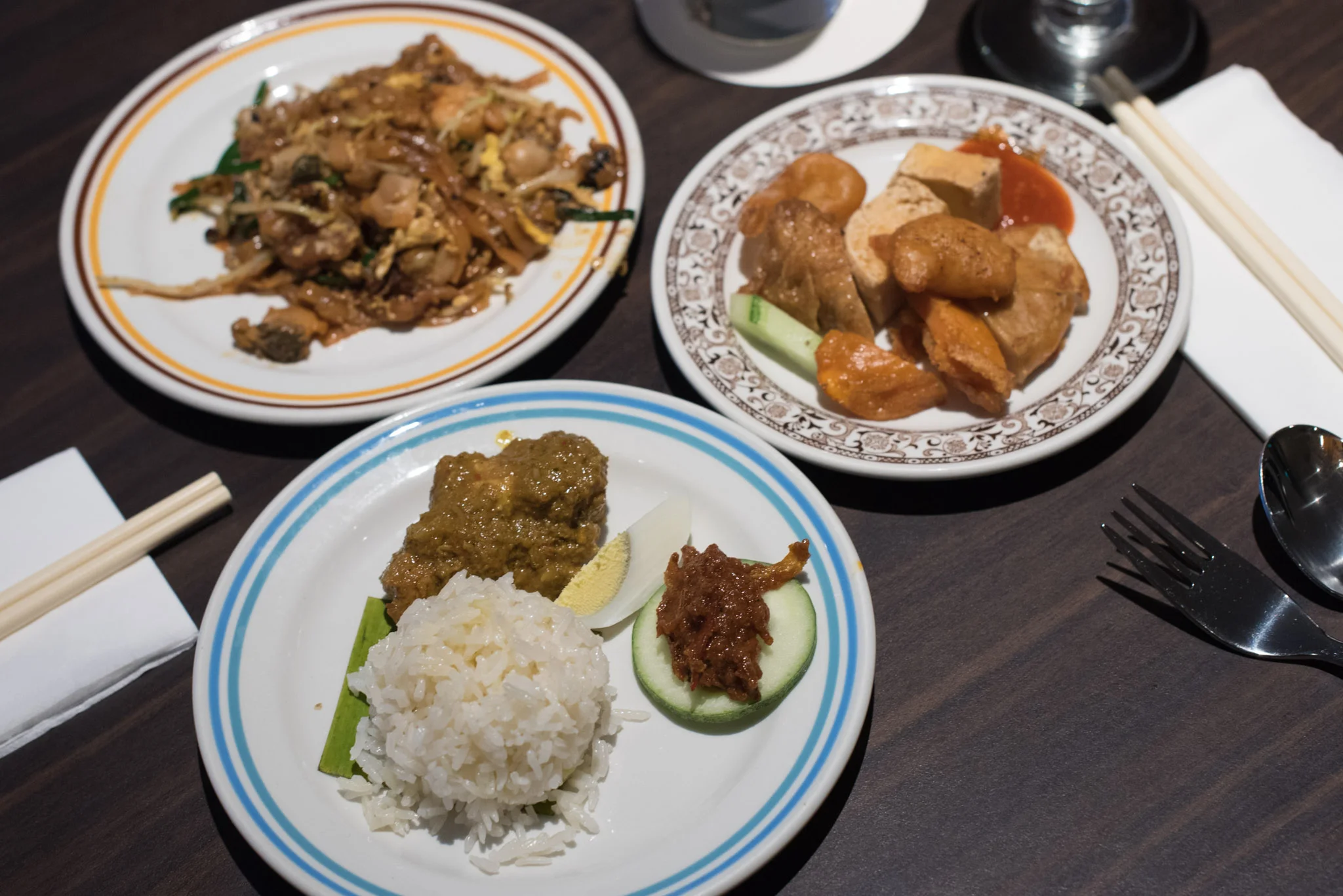 Clockwise from Top Left: Char Kway Teow, Lok Bak, Nasi Lemak with Nonya Chicken Kapitan