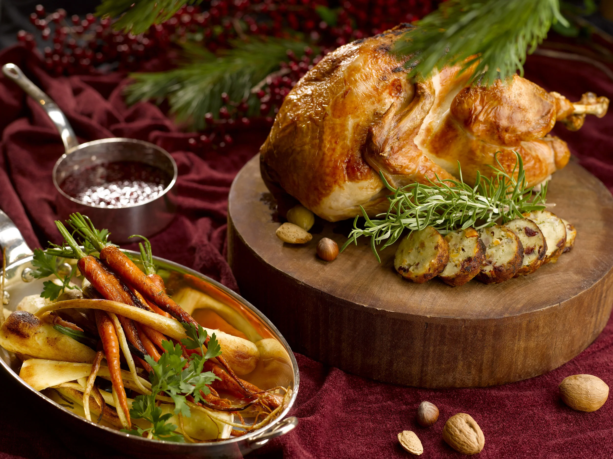 Finally, from the patisserie, an assortment of pastries will include white chocolate with lemon curd and raspberry log cake; ombré butter-cream rainbow cake; old fashioned apple-cranberry pie with vanilla sauce; gingerbread cookies; homemade pralines; and champagne truffles — all of which are sure to raise holiday spirits.