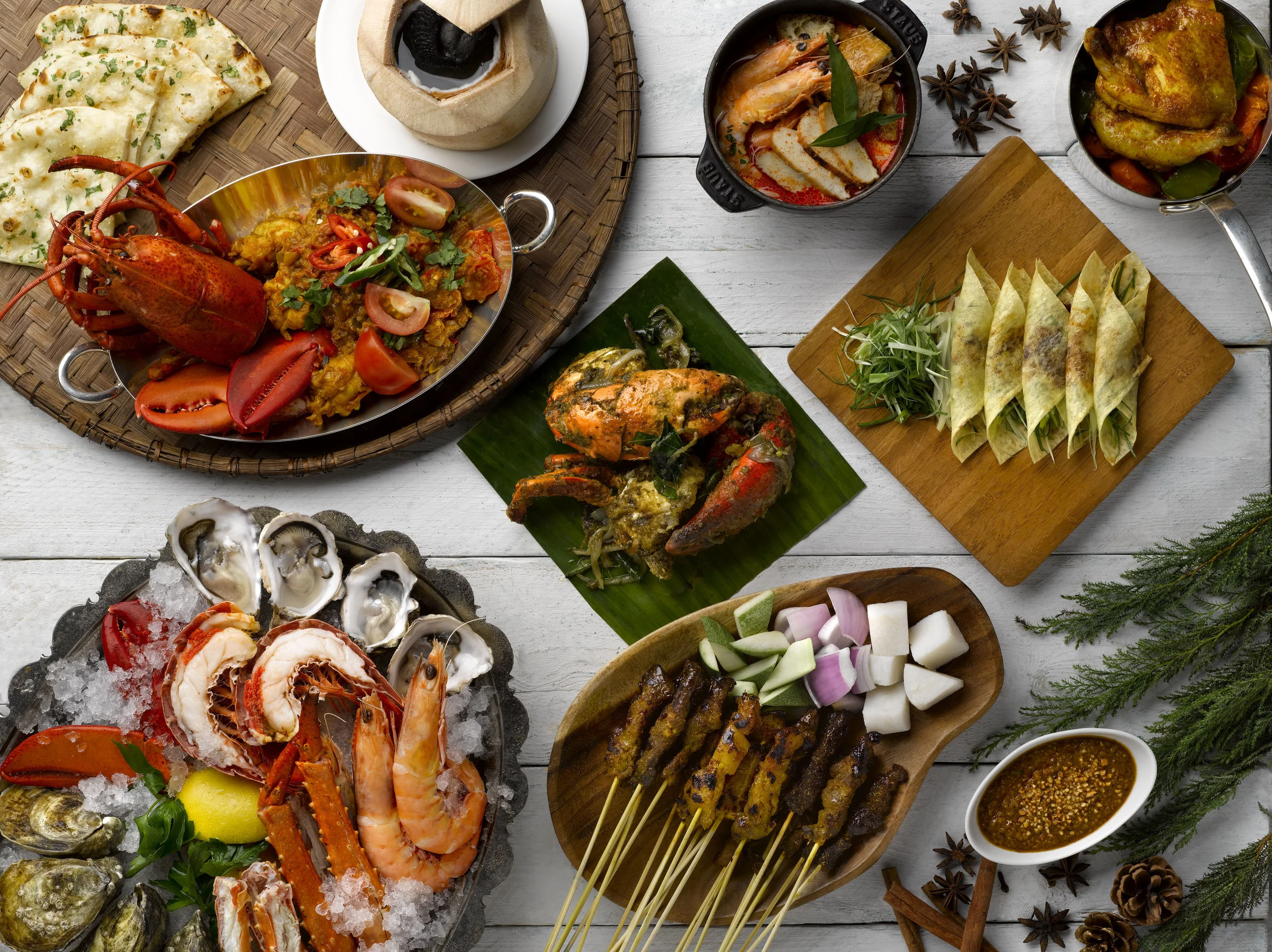 With a truly Singaporean touch, StraitsKitchen is presenting a buffet menu of authentic Chinese, Malay and Indian classics whipped up in Halal-certified kitchens. Highlights of the evening will include double-boiled Chinese herbal soup served in a whole coconut, Indian Hyderabadi dhum biryani (lamb shank with long-grain rice), Malay kambing cop bakar and more. A chilled sustainable seafood bar will feature poached tiger prawns, Boston lobsters, Alaskan crab legs and freshly shucked oysters. Last but not the least, a carving station will feature succulent whole-roasted turkey and chicken ham. Local twists on classics such as pandan log cake and chempedak fruitcakes will also be featured.