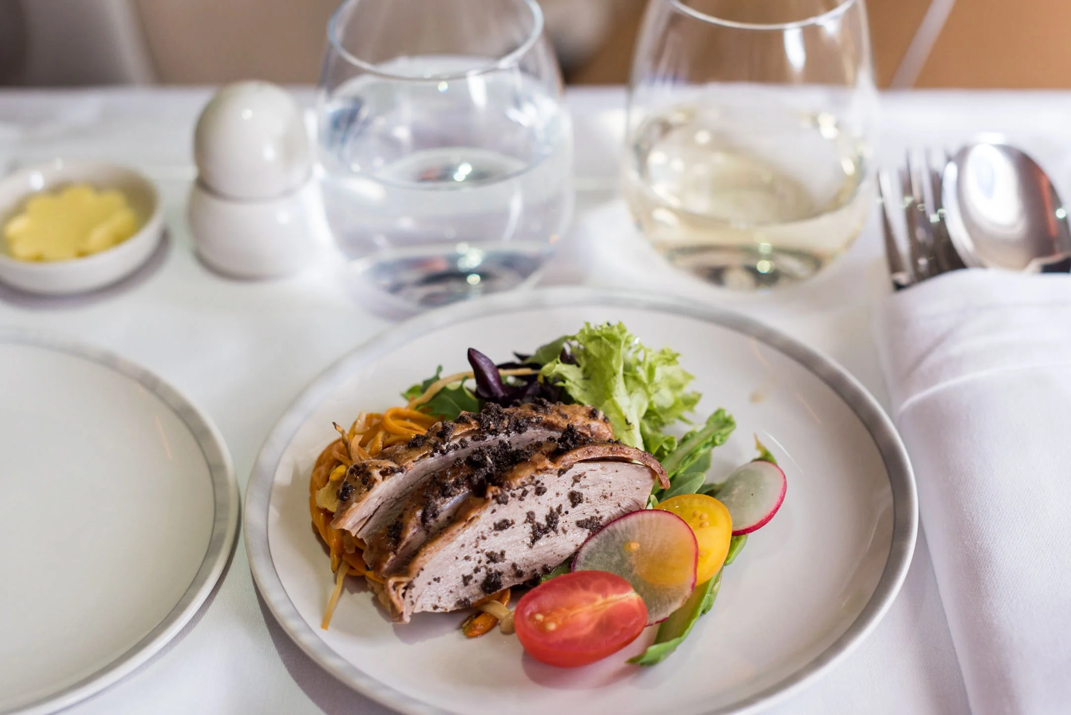 Since it was a relatively short flight (approximately four hours), lunch service began shortly and as I flipped through the pages of the menu, I noticed that there were dishes from the latest partnership with Ming Court (Michelin 2-star restaurant) in Hong Kong - of course I had to try those! Lunch service started with an appetiser of Truffle Marinated Roast Duck with Cordycep Flower and Mushroom Salad (created by Ming Court). I always find it hard to judge food (especially when it comes from a Michelin-star restaurant) on-board a flight because there are always all these expectations that come with it - I know I should not expect much since it is served 40,000 ft in the air but I cannot help myself. This dish was actually pretty decent if you throw the whole Michelin-star glory out of the window - the duck was a tad dry but the cordycep flower and mushroom salad was pretty delicious.
