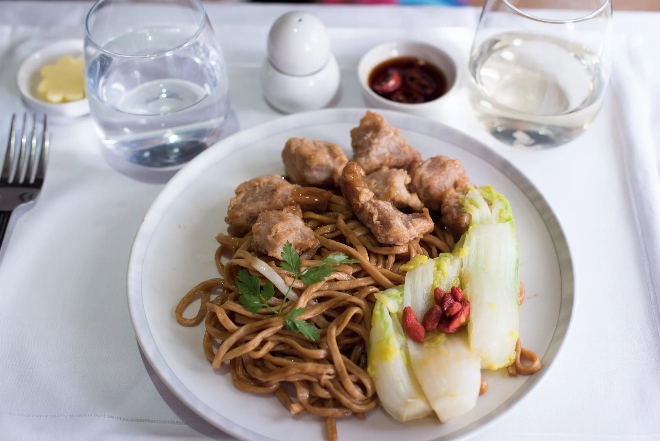 Since I was fairly interested to see what Ming Court has up their sleeves, I opted for the Iberico Pork with Shanxi Aged Vinegar and Enoki Mushrooms Ee Fu Noodles instead. Do note that Book The Cook (BTC) service is available on this flight but the menu isn't particularly exciting so I have decided to go with what was available in the cabin instead. While the name of the dish sounded pretty impressive, the food did not look or taste as good. Vegetables were overdone, the ee fu noodles were mildly-flavoured and the Iberico Pork was pretty dry to say the least - this was perhaps the most disastrous dish I have ever had on-board Singapore Airlines.