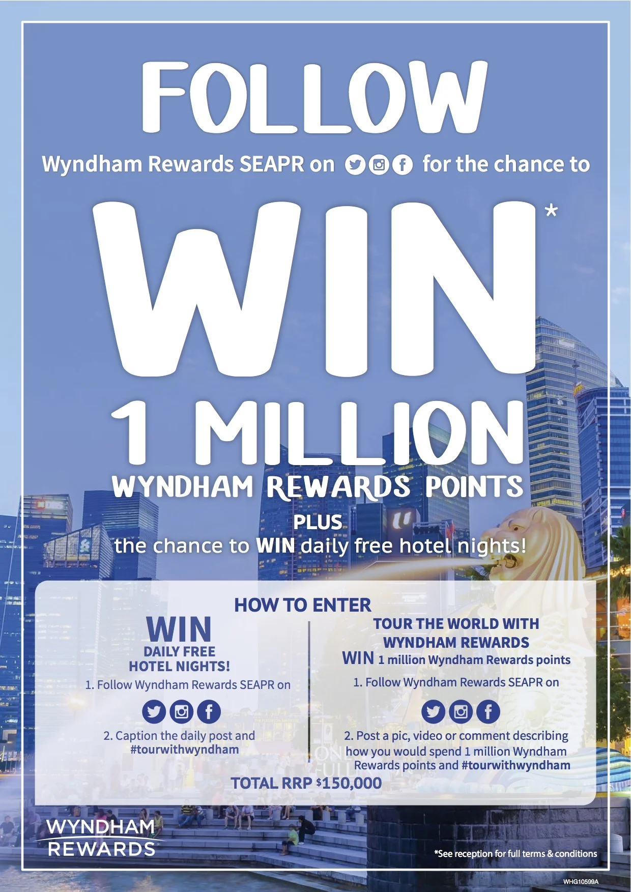 Between 01 September 2016 to 31 October 2016, "Tour the World with Wyndham" across three social media channels (Facebook, Instagram and Twitter) to reinforce how easy it is to earn and redeem hotel rewards with the hospitality giant's revamped rewards program, Wyndham Rewards (read more about it HERE!). Stand a chance to win the grand prize of ONE MILLION Wyndham Rewards points which is equivalent to 66 FREE room nights - there are also daily hotel stays to win even if you do not snag up that enviable grand prize.
