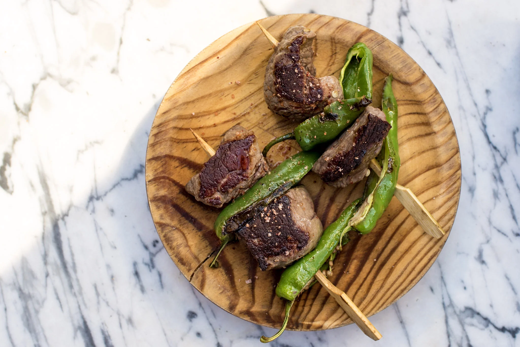 Grilled Beef Eyefillet Skewers, Piquillo Peppers, Salt