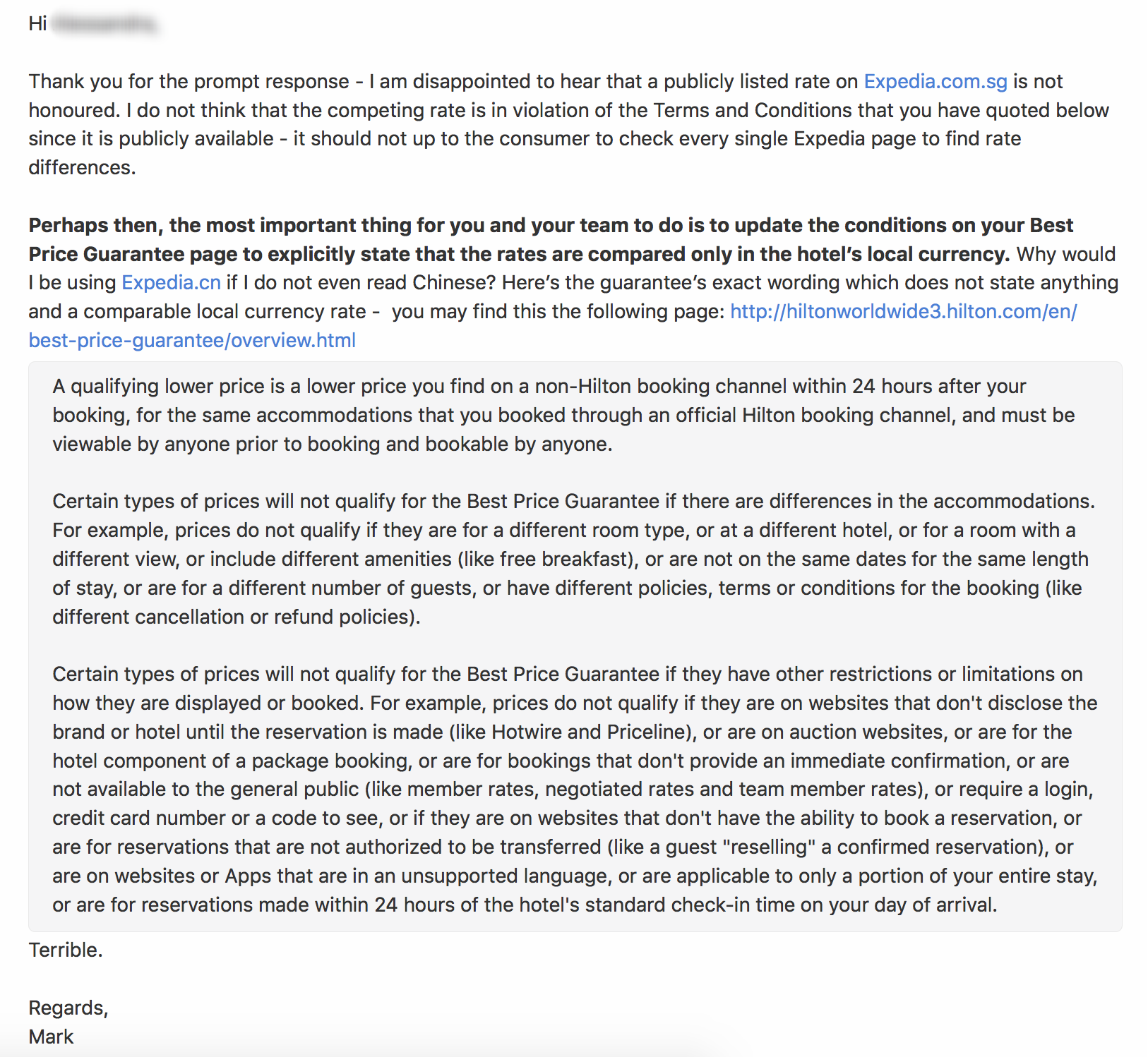 Hilton's Best Price Guarantee claims to "honor the lower price AND take an additional 25% off the room rate for each night of [the] stay". Technically speaking, I should be offered a room rate of CNY 1,183 (SGD 241) before applicable taxes per night after the 25% off. Instead, I got an email notifying me that the competing rate that I submitted was not to be found (I can still find the competing rate 24 hours later). It turns out that the Corporate Guest Relations Specialist has decided to search for the rate on Expedia.cn despite my submission for Expedia.com.sg. In fact, on her email, she claims to have reviewed Expedia.com but the attachment that she sent through shows that she has gone through Expedia.cn instead.
