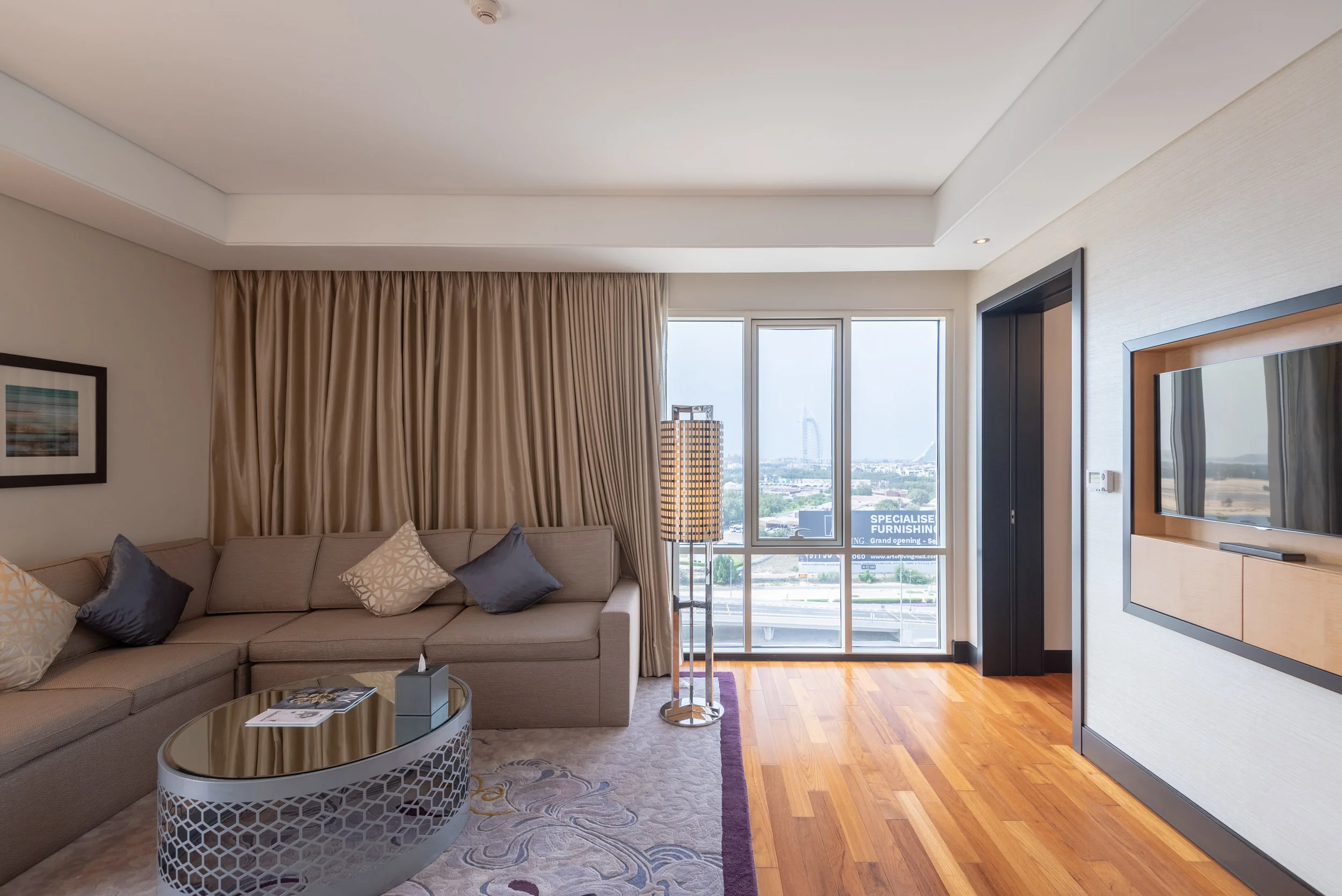 The living room of the Corner Suite is massive and that sofa sits at least six adults very comfortably. You also get a 270-degree view of the area and the Corner Suite that I was allocated to had a view of the beautiful swimming pool on one side as well as the famous Burj Al Arab on the other. In case you are wondering, this suite is good for two adults and up to two children (the sofa converts into a bed when needed) but the space that you get is just incredible.