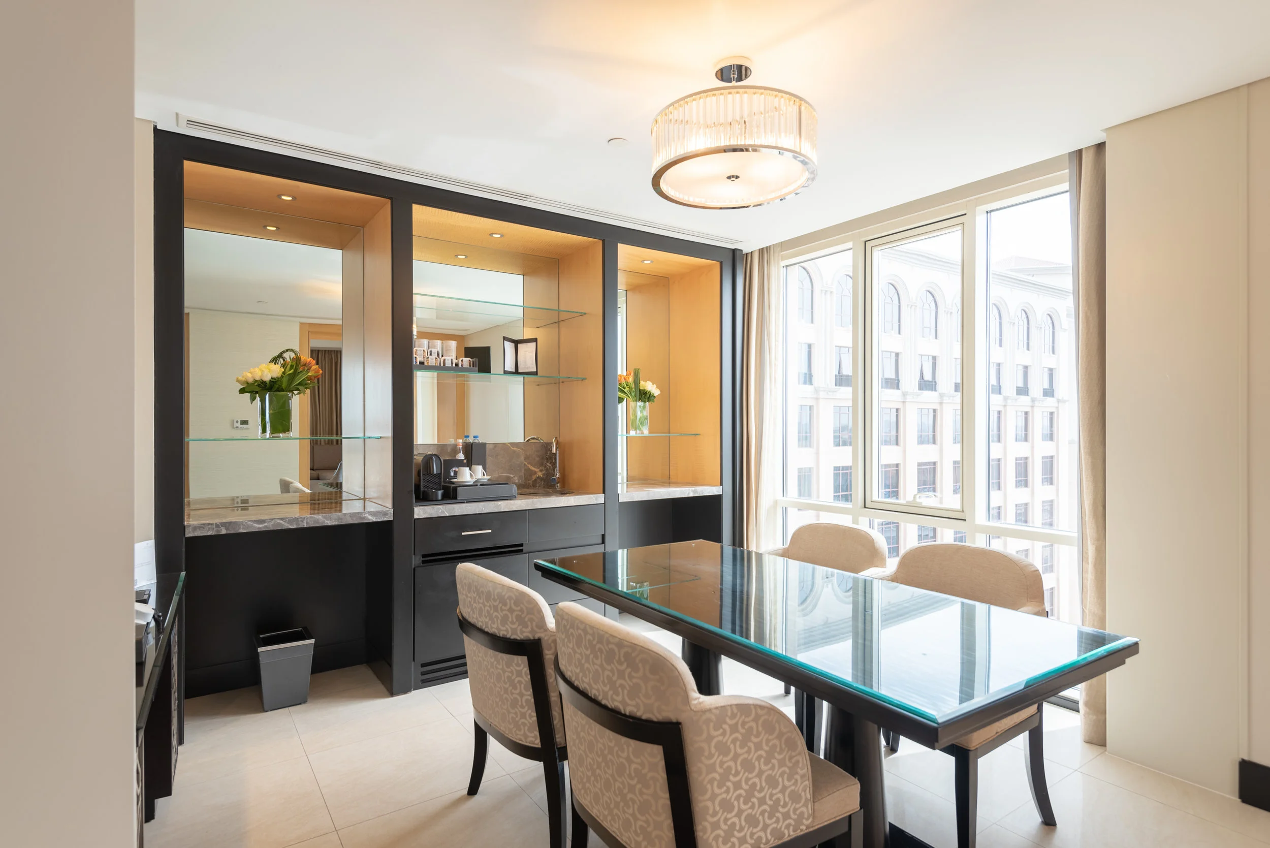 The Corner Suite also comes with a dining room which also functions as a meeting room - this is where you will find the coffee machine, teabags, minibar and even a sink. The dining table sits up to four adults and it looks out to the two outdoor terrace swimming pools downstairs.