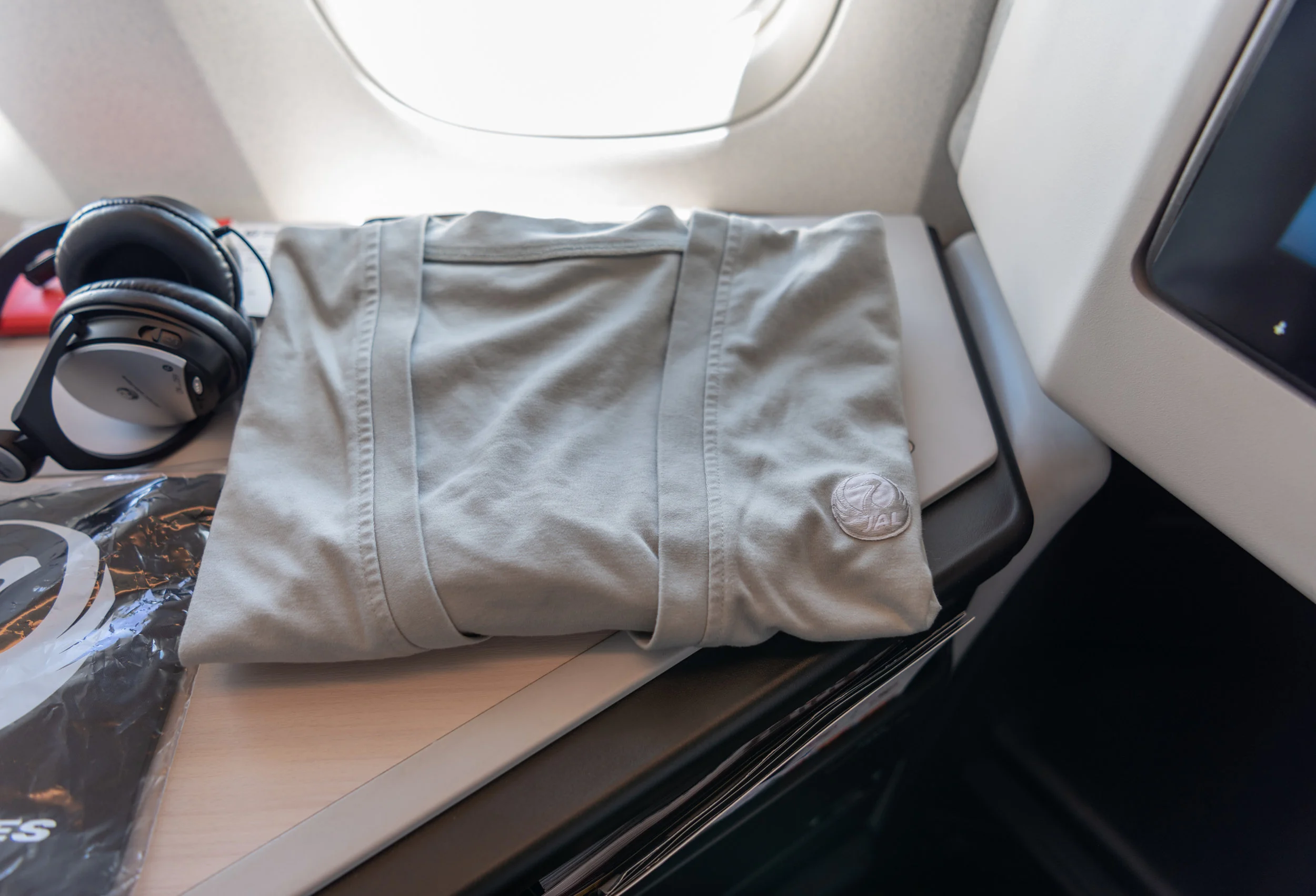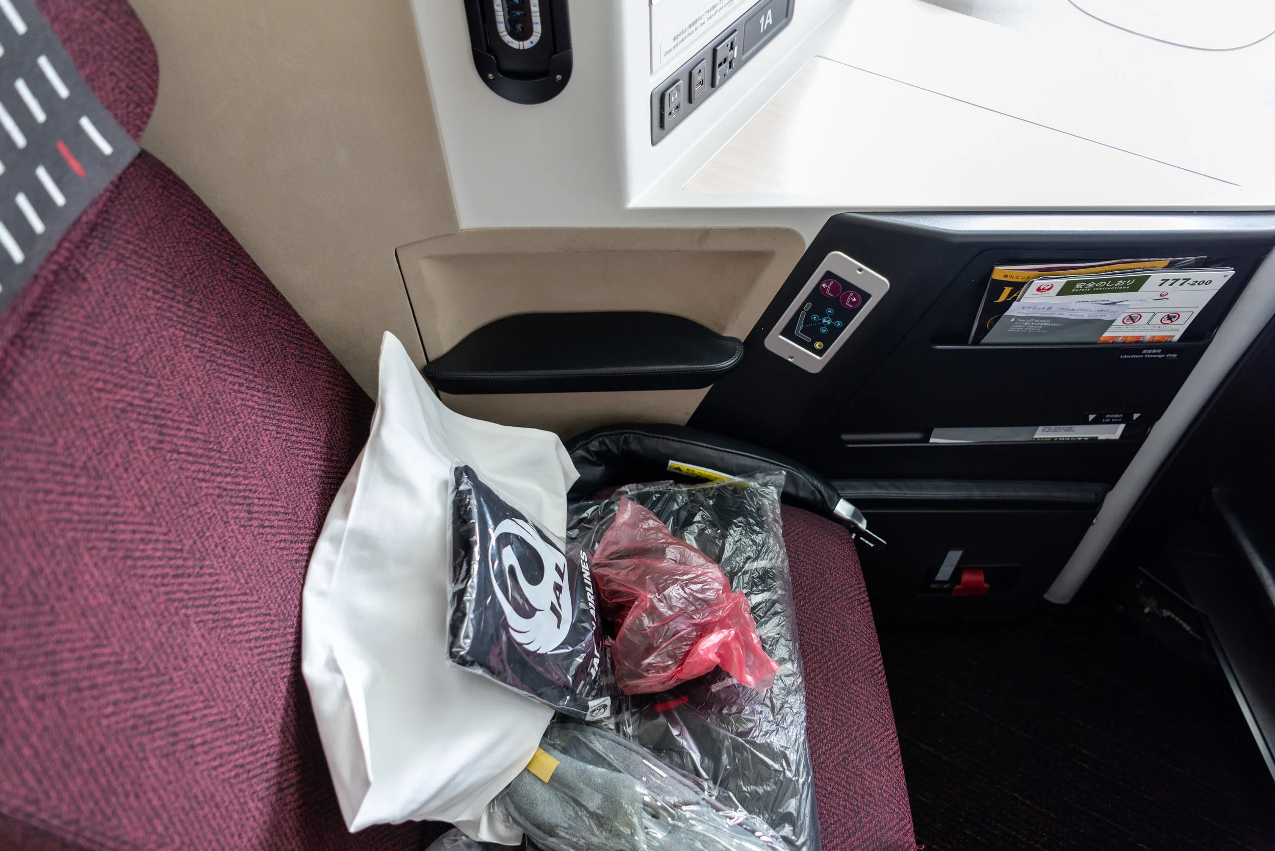 When I flew from Singapore to Tokyo via Kuala Lumpur on this very same trip, I also missed my connecting flight from Kuala Lumpur due to an equipment fault on Malaysia Airlines. Fortunately, I did not encounter any mishaps on my return trip - the flight was scheduled to depart HND at 11:30AM and boarding began promptly at approximately 11:05AM with the top-tier flyers from the JAL Mileage Bank programme boarding first. Since there was no First Class cabin on this flight, Business Class passengers were the second group invited to board. As soon as I got to Seat 1A, I realised that the amenity kit and headphones (in that ugly red plastic bag) have already been placed on my seat.