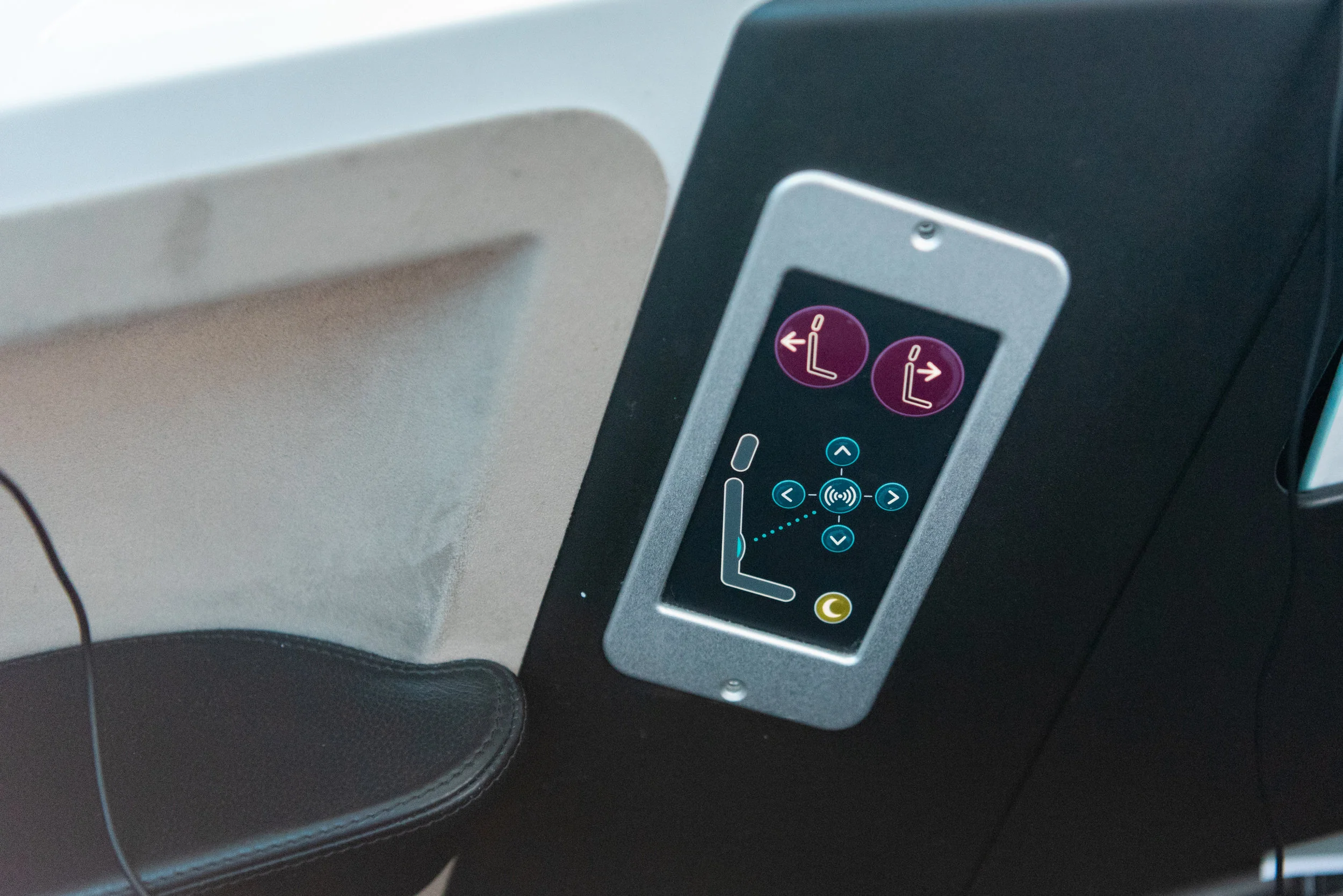 There is plenty of legroom in the SKY SUITE III product and while I am not an incredibly-tall person by far, there is still some space even after my seat has been fully reclined into a full-flat bed. That being said, I did find that the legroom in bulkhead seats on the 787-9 Dreamliner is relatively larger. The moon button on the seat control panel toggles a light in the leg rest area in case you ever need to find something that you have knowingly (or unintentionally) stuffed in during the flight.