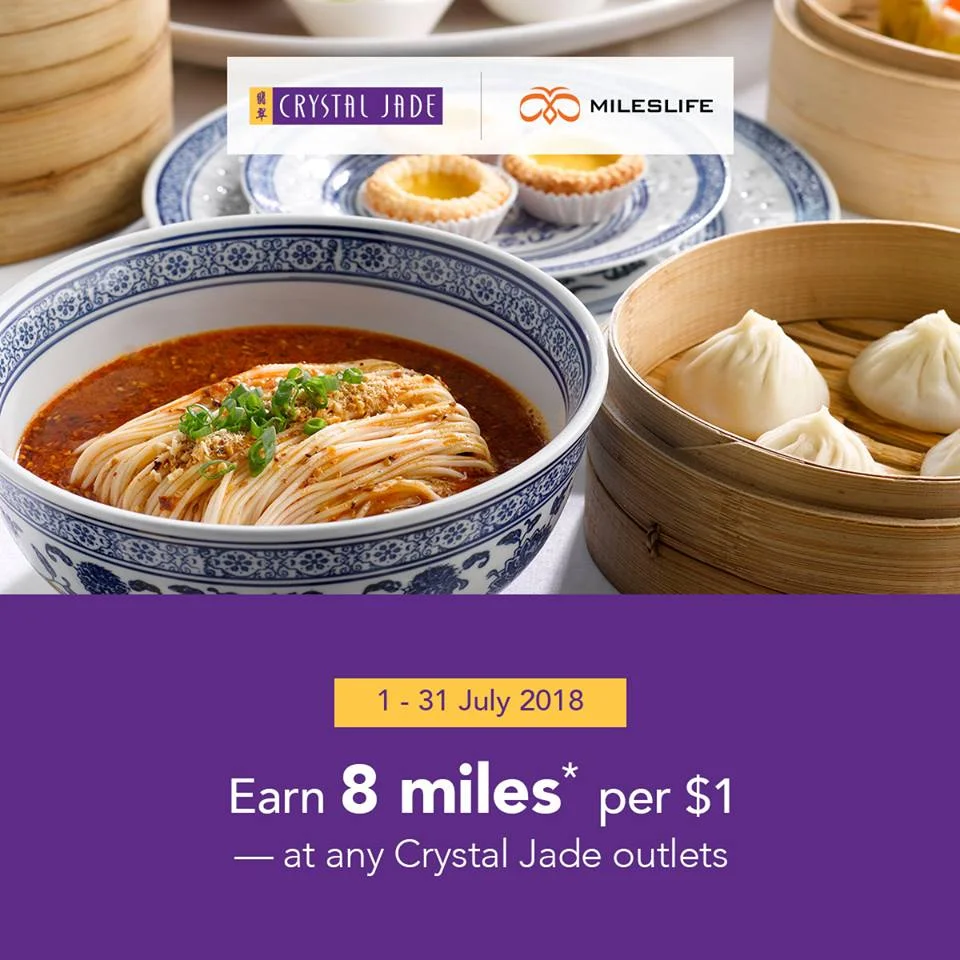 Mileslife is offering 4X more miles for dining transactions made at participating Crystal Jade restaurants across Singapore from 01 July 2018 to 31 July 2018 - this means that you will be able to earn up to 8 miles per dollar at participating restaurants. Additionally, you may also be targeted with an additional 500 bonus miles (promo code below!) for a transaction made this month that is above the value of SGD 49.