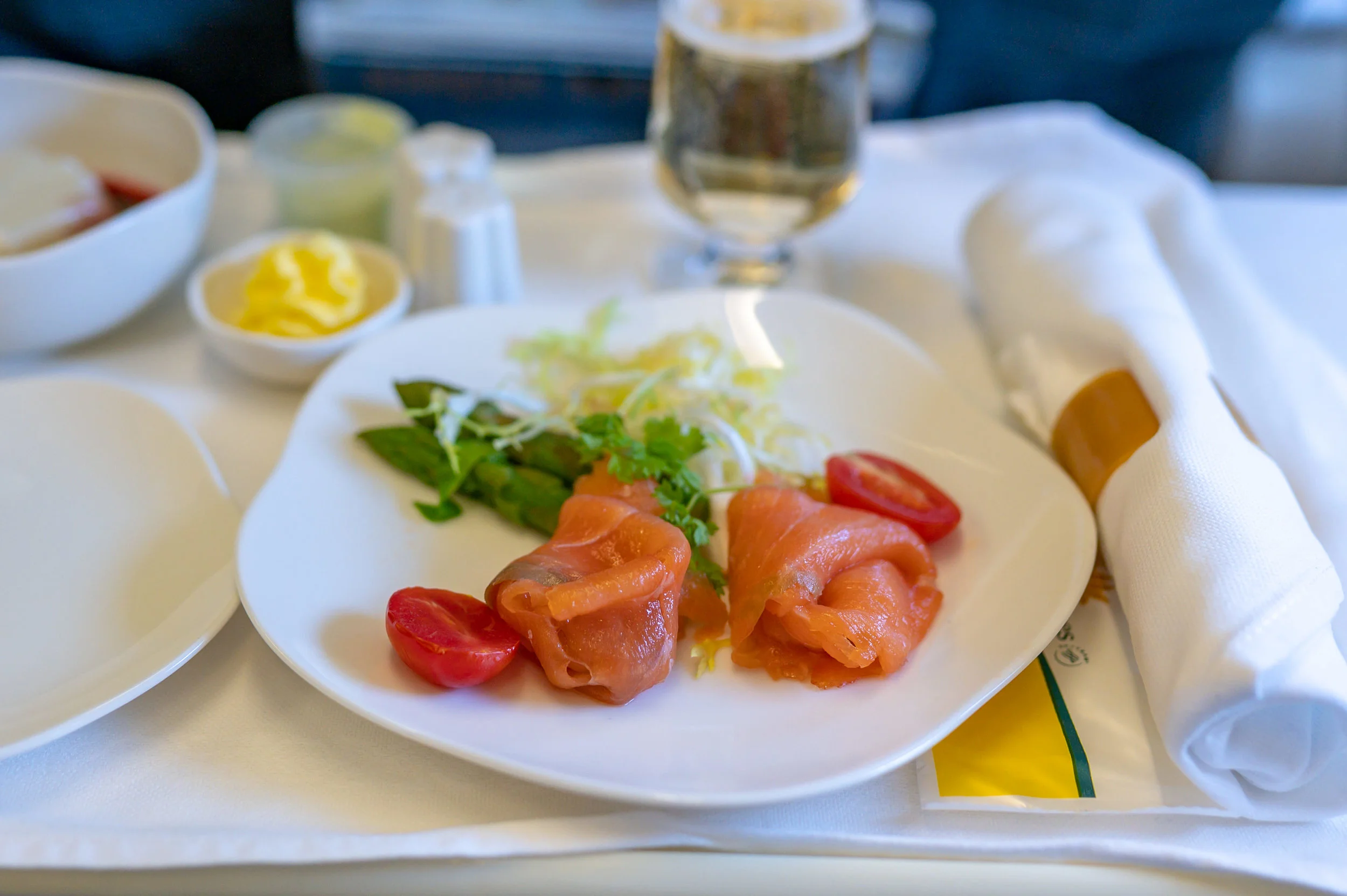 The flight was scheduled to depart at 1:25PM but it only took off at 1:49PM. Having said that, the cabin crew were highly efficient at getting food out (at least in the Business Class cabin). One of the crew went around to set the table up but somehow, she seemed to have missed mine out. It was only when she brought my tray out that she realised that the table has not been set. Honestly, they are not major inconveniences and I was not at all offended in any way - I just found the entire experience to be fairly comical especially when you compare it to Singapore Airlines which operate same route for a similar return-fare (unfortunately SQ was priced significantly higher on one-way flights).