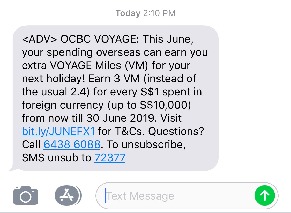Last week, I wrote about how some OCBC VOYAGE Card members are targeted with the opportunity to earn 3.4 VOYAGE Miles (VMs) per dollar on foreign currency transactions made on their card from 24 May 2019 to 30 June 2019. Last night, I received an EDM from OCBC to inform me that I have been targeted for 3.0 VMs per dollar on foreign currency transactions - while this is lower than the previous targeted offer that I did not get, it does have a higher maximum cap.