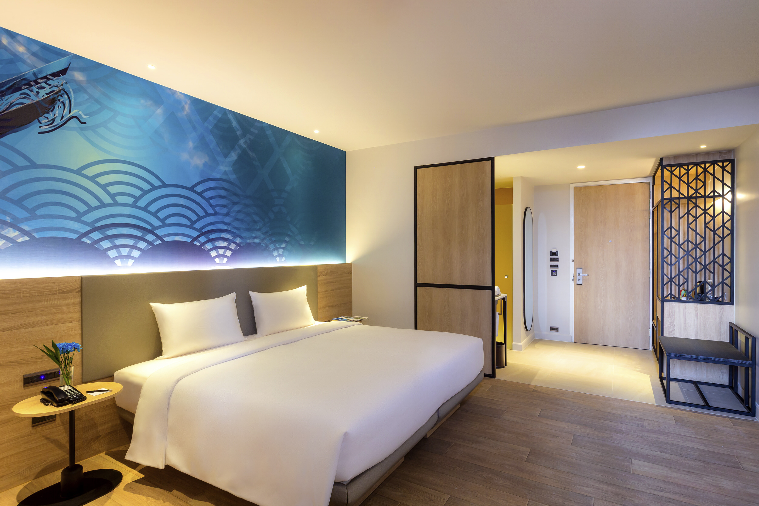 From the moment they enter the lobby, guests experience an airy and dramatic space influenced by music and theater, with sweeping metal flourishes and stage curtains reinterpreted as a backdrop, depicting modern graphic renditions of Thai cultural shows. Each of the 266 rooms here in ibis Styles Bangkok Ratchada feature designs inspired by the creative elements from the Northern, Central, Northeastern, and Southern Thailand that highlight subtle touches of basket-weaving patterns. The bright and colorful rooms range from 25 sqm for a Standard Room to 34 sqm for a Family Room which can accommodate up to four guests. All rooms feature a 43” Smart TV, and the signature ibis Styles SweetBed for a restful night’s sleep.