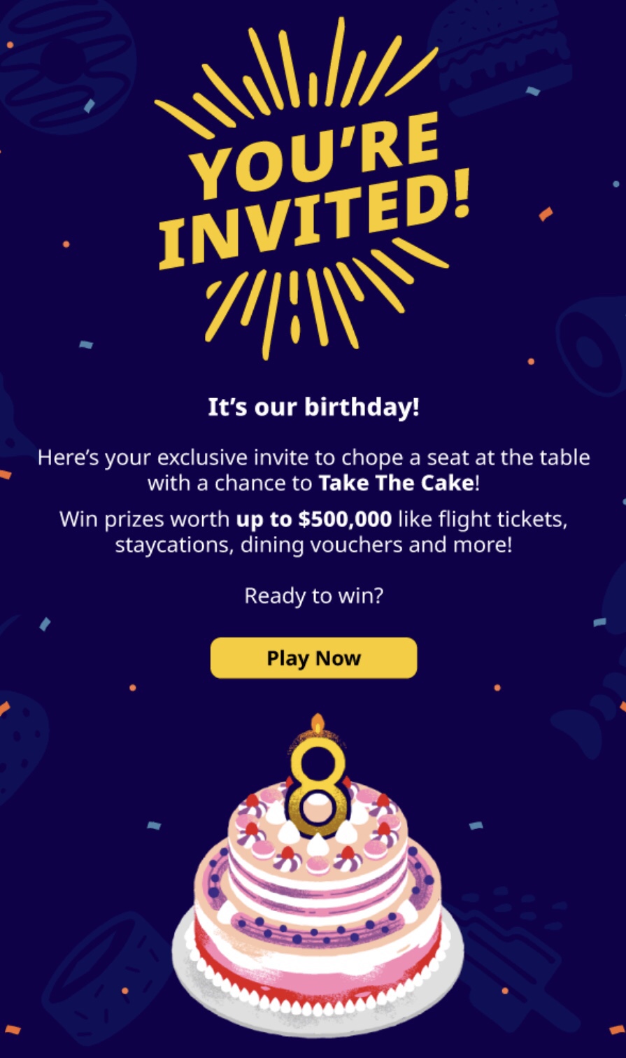 Chope is celebrating her 8th birthday by giving everyone a chance to ‘Chope a Seat and Take The Cake’ from 15 June 2019 to 07 July 2019. With prizes ranging from complimentary hotel stays to flight tickets, this is really the time for you to jump right in and try your luck (there is no cost involved anyway). All you have to do is to sign-up for an account (do note that this is different from your usual Chope account) and spin the lazy susan on the table!