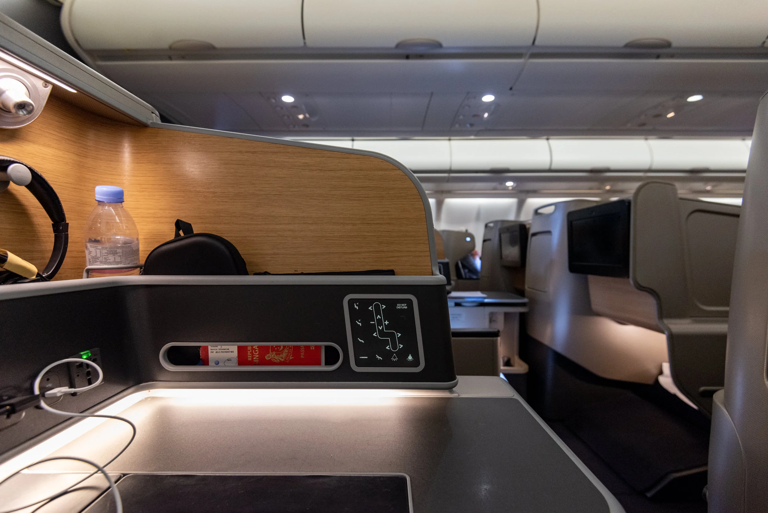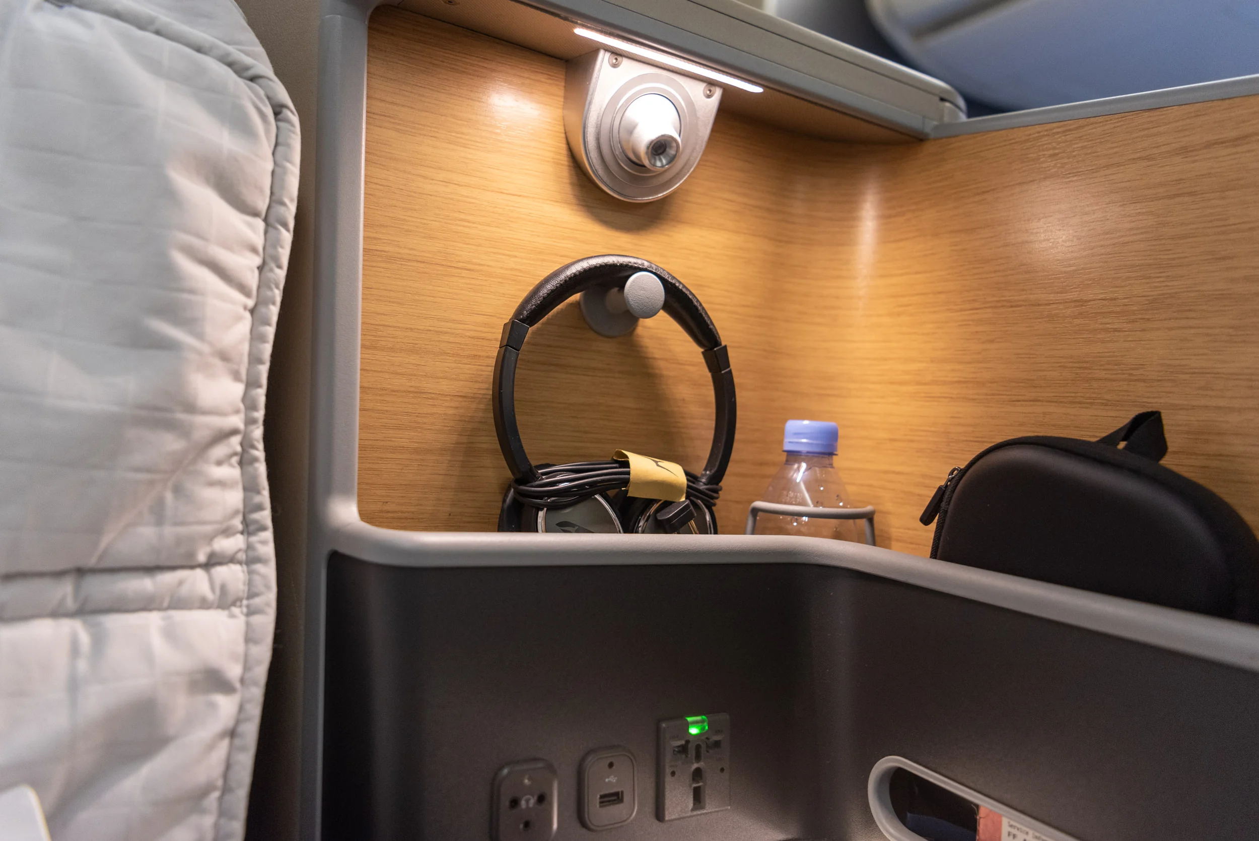 The Business Class cabin product on the A330-300 product is beautiful and I really like the ambient lights that you can turn on and off. As you would expect, you will be able to charge your mobile device via the USB Charging Port and there is also a universal power outlet if you need to charge your laptop (or prefer to use a high-power charger for your device). I also like that Qantas provides bottled water in each seat - while it not exactly the 'minibar' that you get on the Emirates' A380, it helps that you do not have to bother one of the cabin crews for water.