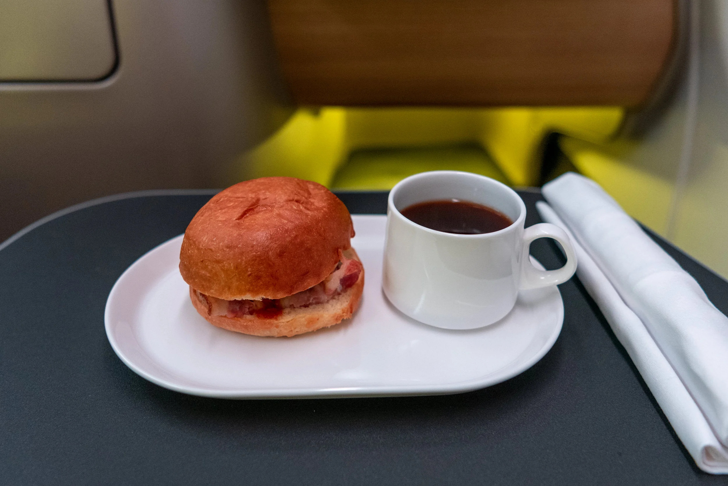 The cabin crew then pushed a dessert trolly out into the Business Class cabin for passengers wanting to indulge a little more. On the trolley, passengers could choose from a warm cinnamon donut with praline cream, ice-cream or some seasonal fruits. Obviously, I went for the most indulgent option which was the warm cinnamon donut - it was absolutely delicious but I did not dare to think about the sugar content in this one. Let's just say that it was very satisfying (especially if you do not have a solid diet plan). A range of snacks like fruits, biscuits as well as chocolate bars are also offered throughout the flight (in case you get peckish) but I did not have any since I wanted to drift off to bed after dinner.