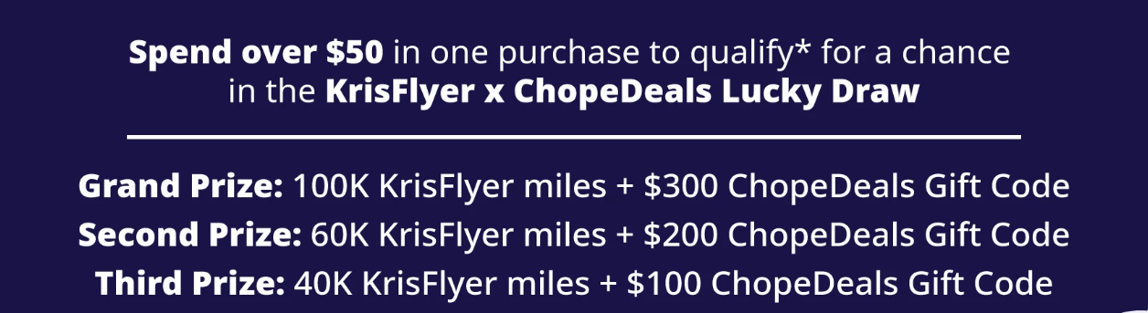 As mentioned earlier, the promotion will run from 01 September 2019 to 31 October 2019 and you will only receive a lucky draw chance if you spend S$50 and above on ChopeDeals - you must also enter your KrisFlyer membership number in order to be eligible. The grand prize of this giveaway is 100,000 KrisFlyer Miles and a S$300 ChopeDeals Gift Code - the lucky draw will be conducted on 04 November 2019 and winners will be notified by 08 November 2019.