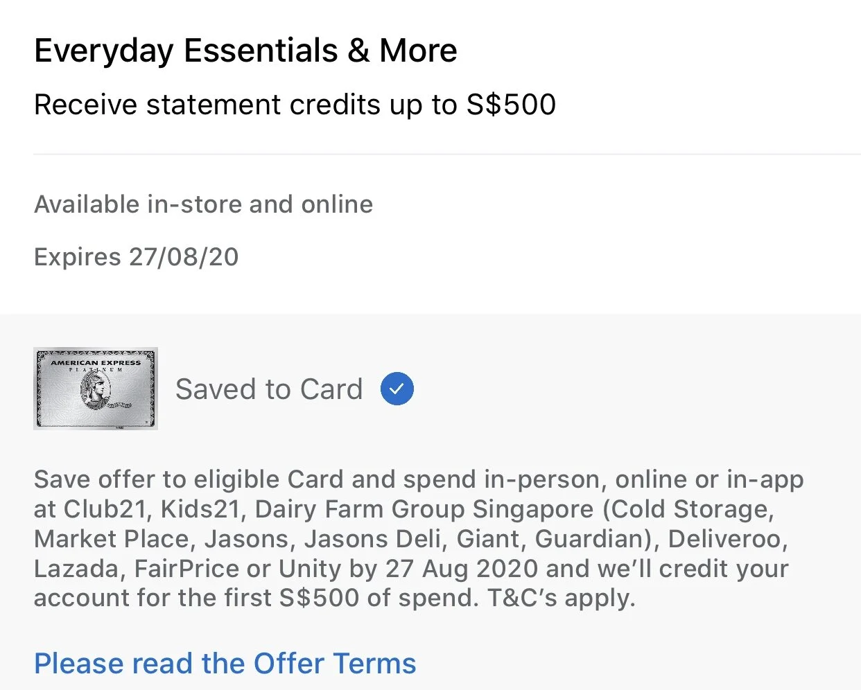American Express has published a list of Everyday Essentials Merchants where Platinum members will be able to enjoy up to S$500 statement credit when they spend in Singapore Dollars - all payments must be charged to an eligible Platinum Card by 27 August 2020. According to the terms and conditions of this offer, supplementary cards are not eligible for this offer (make sure you save the offer on your principal card right now before you forget).