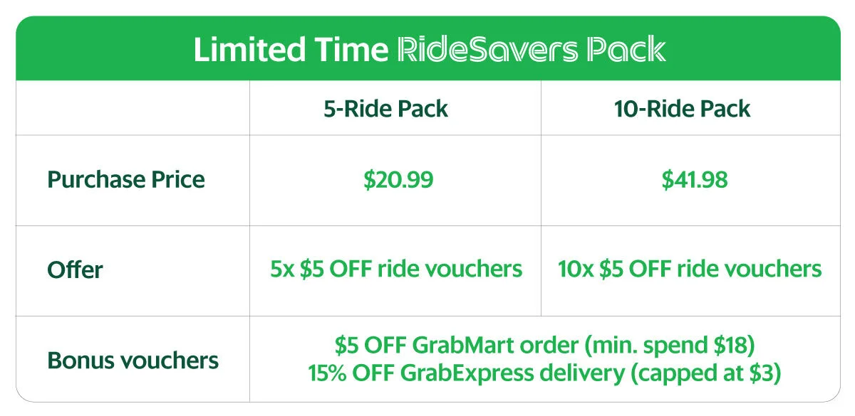 Last week, Grab offered select users first dibs at a Grab Foodie Pack Subscription. Yesterday, Grab unveiled the RideSavers Pack, allowing users to make a one-time payment to enjoy five or ten $5 vouchers at a 16% discount - all vouchers are valid for six weeks from the date of purchase.