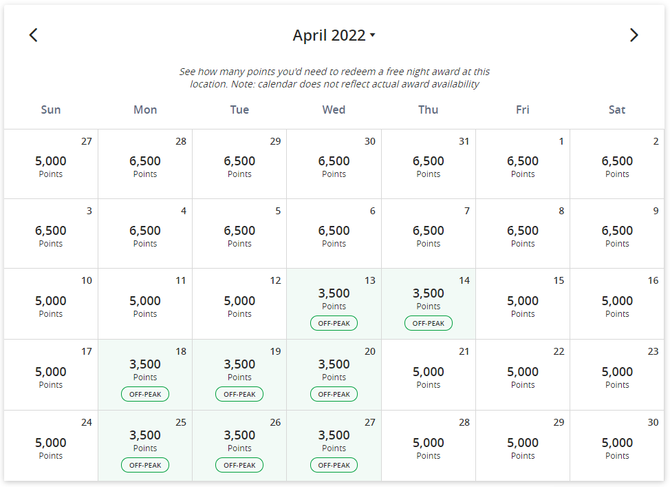 Off-peak: 3,500 Points per Night (USD 58.80)