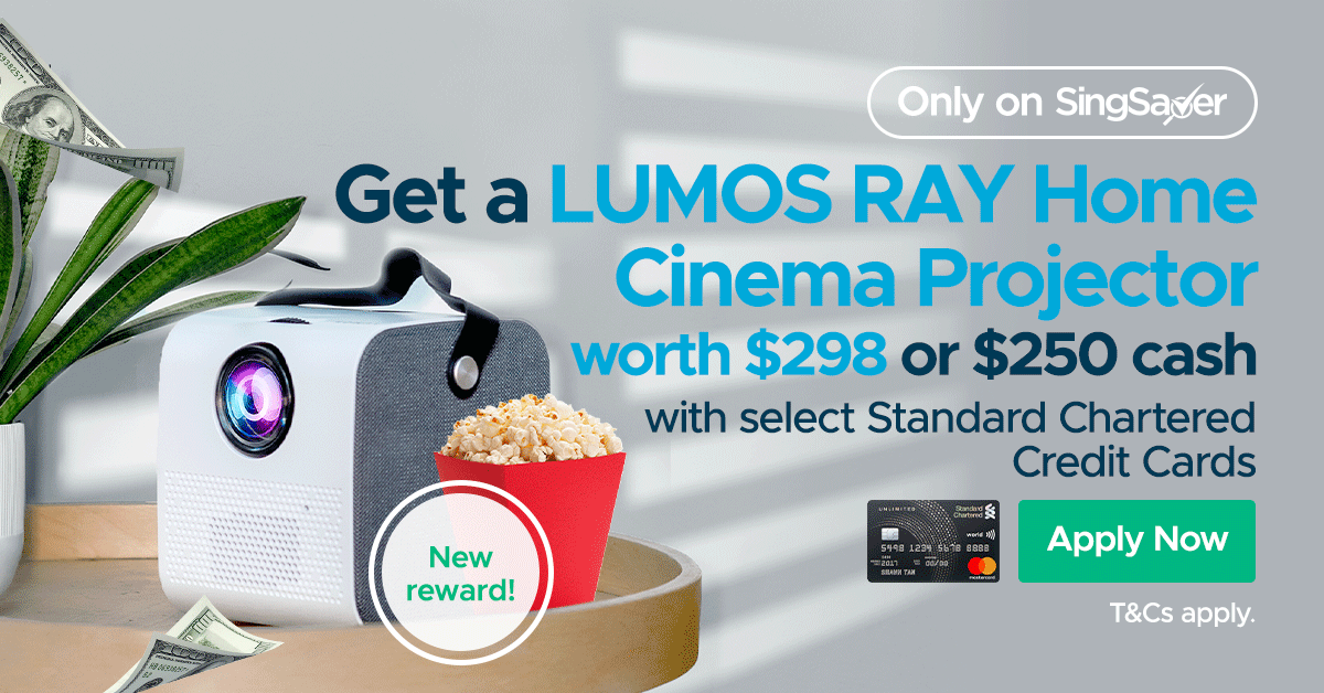 Choose between a LUMOS RAY Home Cinema Short Throw Projector (Smart Version) worth S$298 or S$250 cash reward via PayNow when you sign-up for any Standard Chartered credit cards in this article as a new customer between 8-20 September 2021, and spend at least S$300 in eligible transactions within 30 days of card approval.