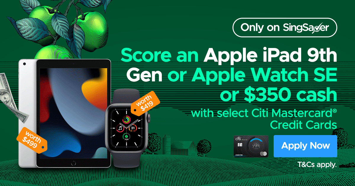 Apply for any one of the five listed Citi Credit Cards in this article between 21-31 March 2022 as an eligible new customer and spend at least S$500 within 30 days to receive the latest Apple iPad (9th Gen), a Dyson V8 Slim Fluffy vacuum cleaner, or S$350 cash!