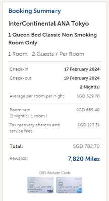 To illustrate this, consider two nights at the InterContinental ANA Tokyo which is going for approximately S$659.40++ (S$782.70 nett) in February 2024 at the time of writing - you will earn 10 miles per dollar on the total spend of S$782.70 which brings your total earn rate to an impressive 7,820 miles.