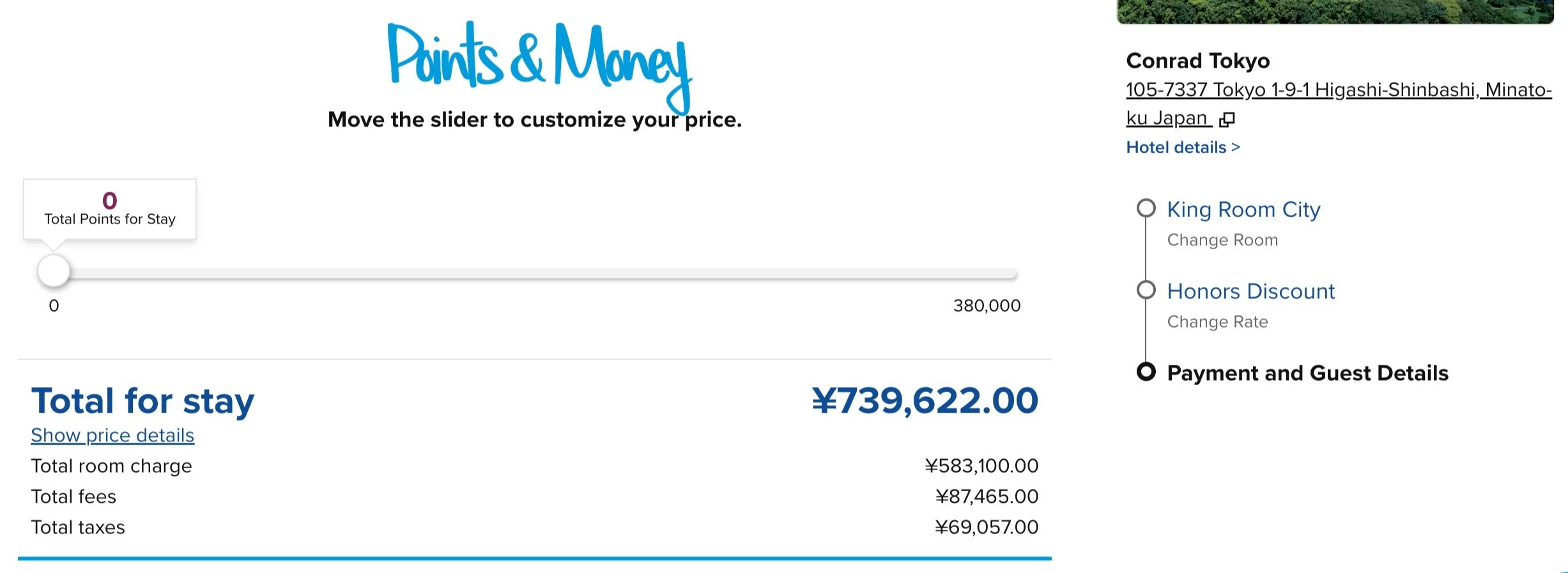 A five-night stay at the Conrad Tokyo can cost around 739,622 JPY (approximately USD 5,350) in the Spring but the same stay for the same room type will only require 380,000 points which you can effectively purchase for USD 1,900 (with some creative point-pooling) - this represents an almost 65% discount!