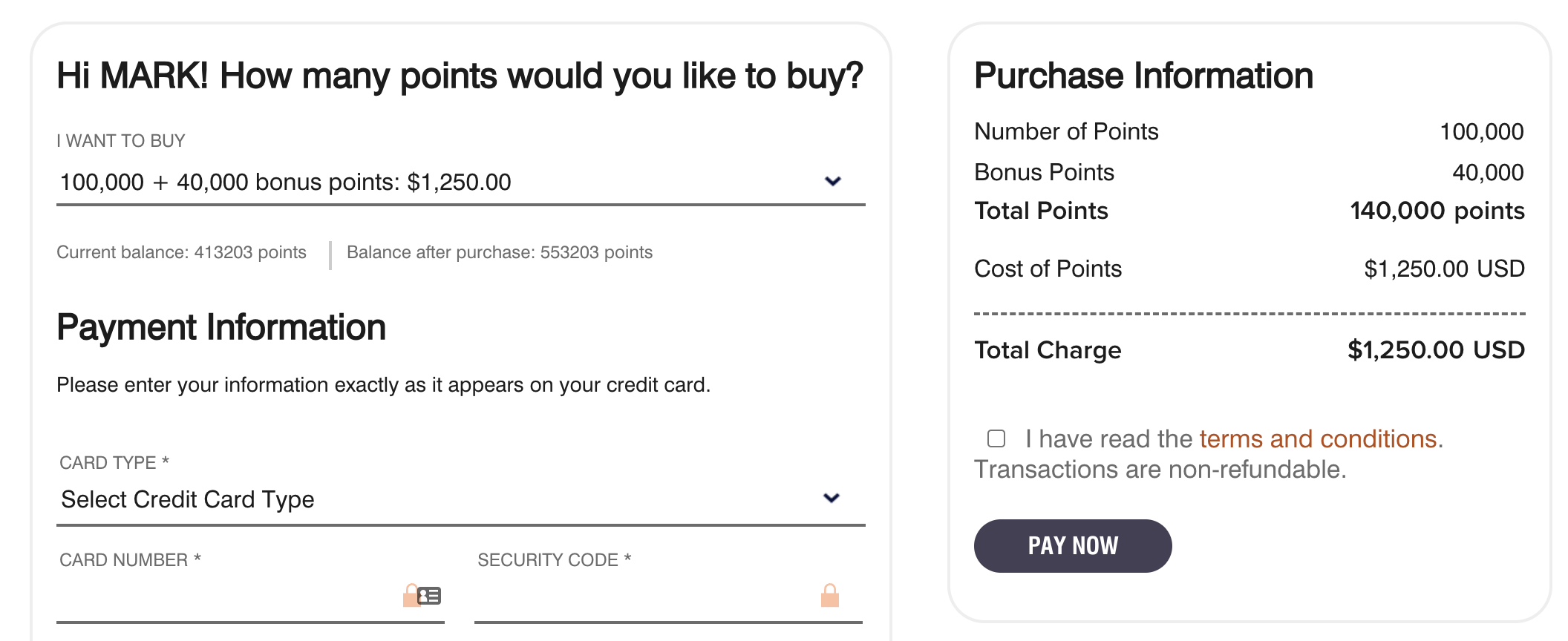 40% bonus when you buy 40,000–100,000 points (0.89 US cent per point)