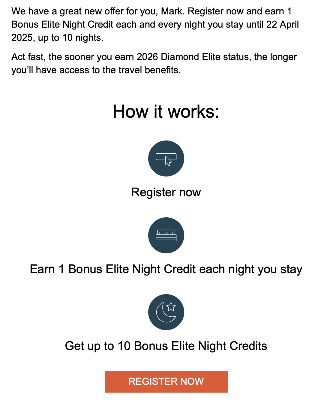 IHG One Rewards has launched a targeted promo allowing members to earn 1 bonus elite night credit for every eligible revenue night consumed between the time of registration and 22 April 2025, up to 10 nights. Bonus nights will count towards elite qualification and milestone rewards this year.
