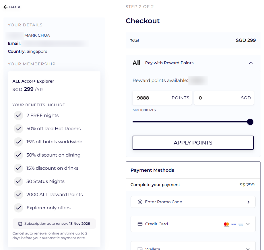 I had sworn off renewing my Accor Plus membership, but the new Accor+ Explorer offer is starting to look a little too tempting - especially since I’m sitting on a healthy stash of ALL Reward points. Right now, the S$299 annual fee can be fully covered with 9,888 ALL Reward points, and once you factor in the 2,000 bonus ALL Reward points awarded to new subscribers, the effective outlay drops to about 7,888 ALL Reward points (≈ €157.76 or S$238).