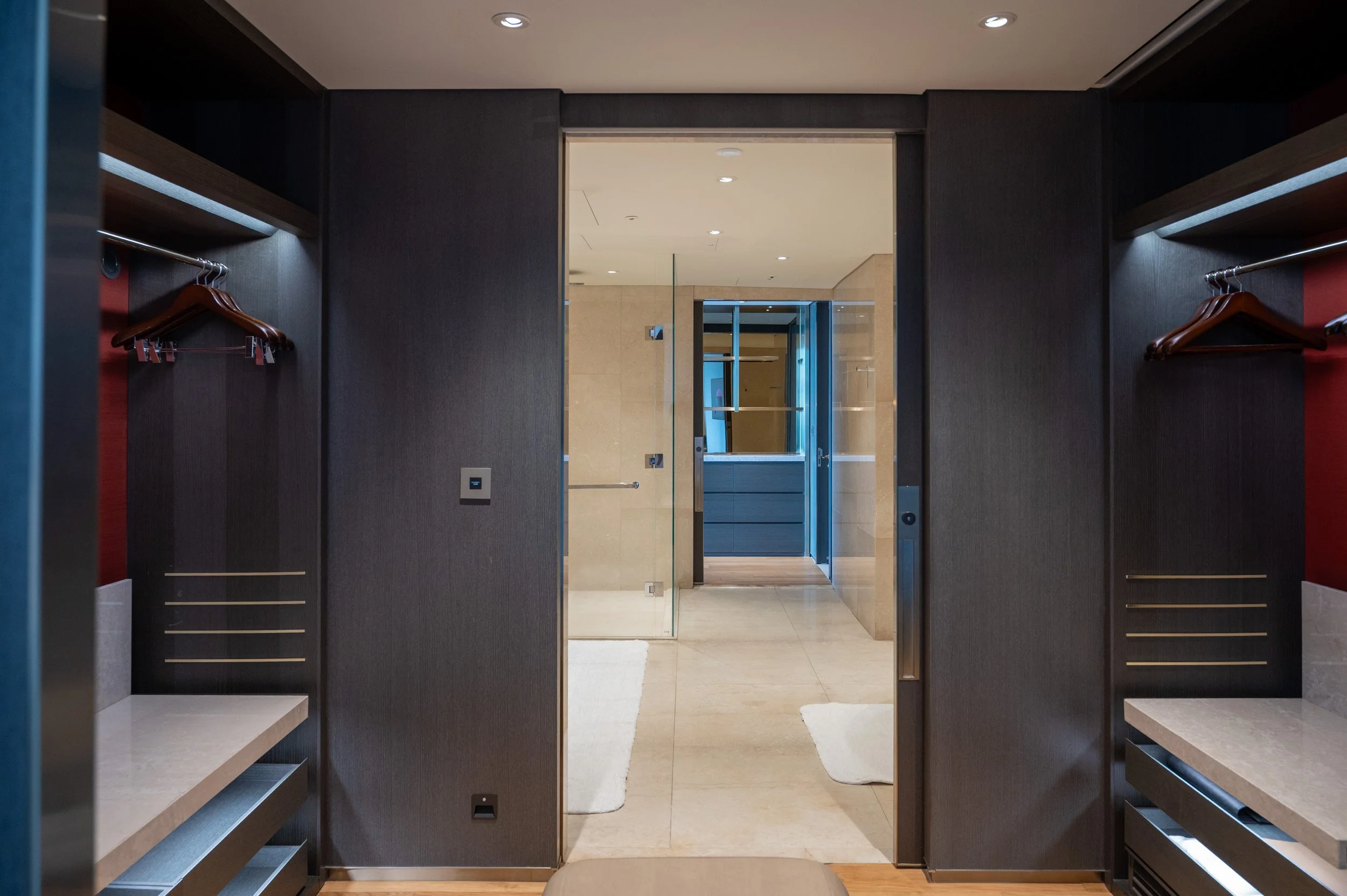 Connecting the bedroom to the bathroom is a dedicated walk-in wardrobe that effectively serves as a private dressing area. The layout functions as a wide corridor flanked by open-concept joinery on both sides, providing an abundance of hanging space and shelving that could easily accommodate at least a week’s worth of outfits.