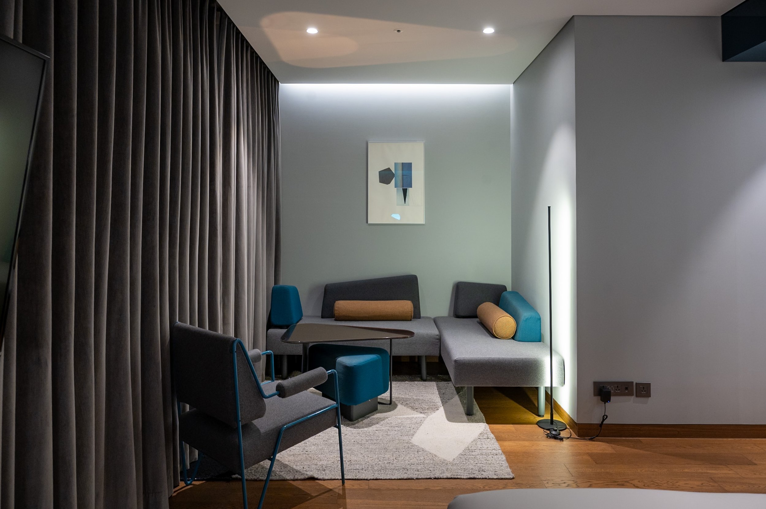 Towards the end of the bedroom, there’s a cosy little nook that features a comfortable sofa and a thoughtfully designed seating area—perfect for lounging or catching up on some light reading. The bedroom TV is mounted on a swivel arm, so you can easily adjust it to face this corner, making it a versatile spot for winding down. Honestly, this ended up being my favourite part of the entire suite—I spent most of my afternoons here, taking in the views of Hongdae while going through my latest Olive Young haul. The warm, earthy colour tones of the furniture and design elements really enhance the calming atmosphere and make the space feel effortlessly stylish.