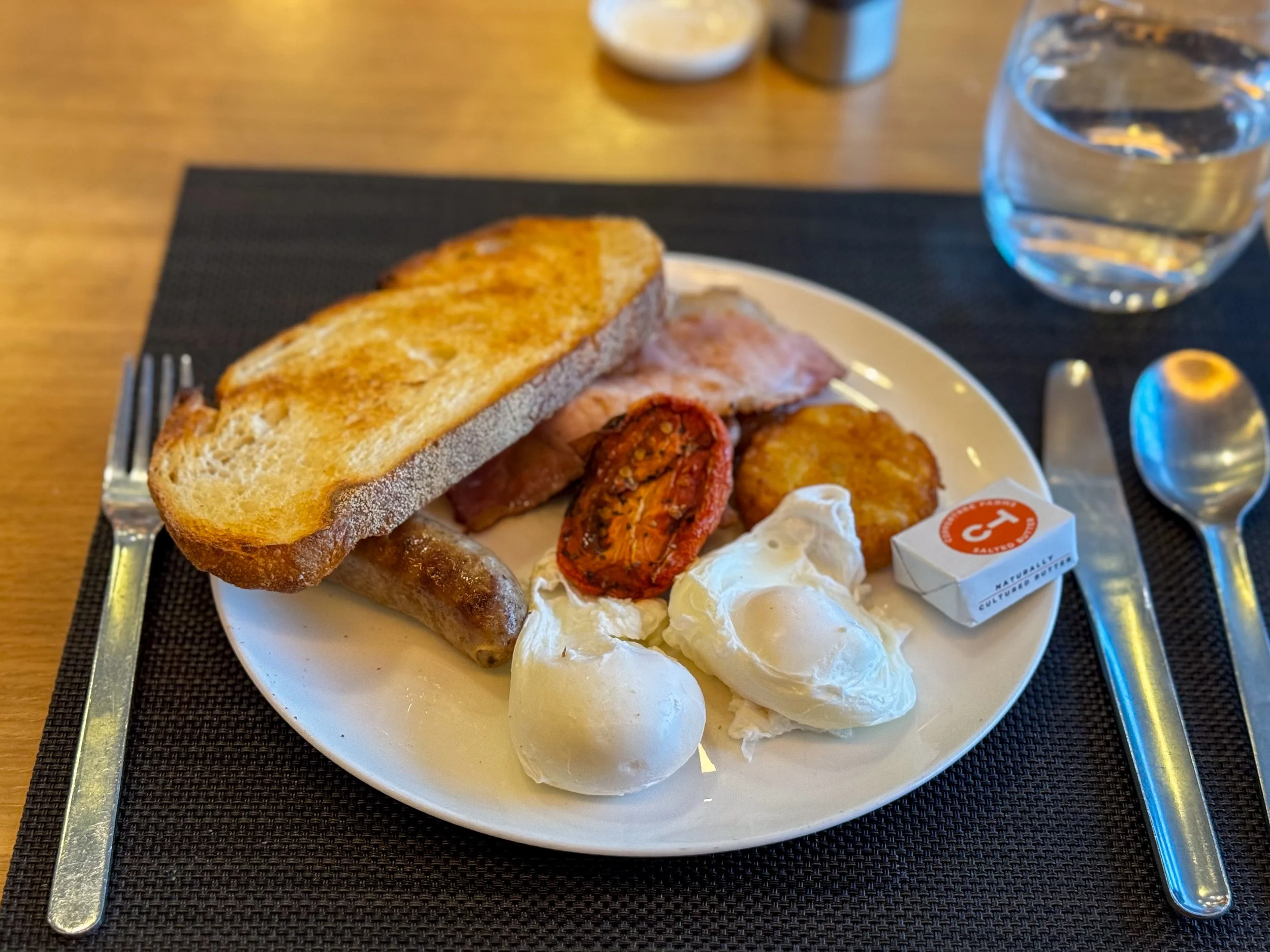 Although I had to walk past the main dining area to access the shower suites, I found it slightly odd that I was asked to return to the front of the restaurant to be seated - even though there were several empty tables available towards the rear of the lounge, closer to the showers. That said, once I was shown to my table, service began swiftly. I was promptly offered a choice of still or sparkling water, and my coffee order was taken without delay.