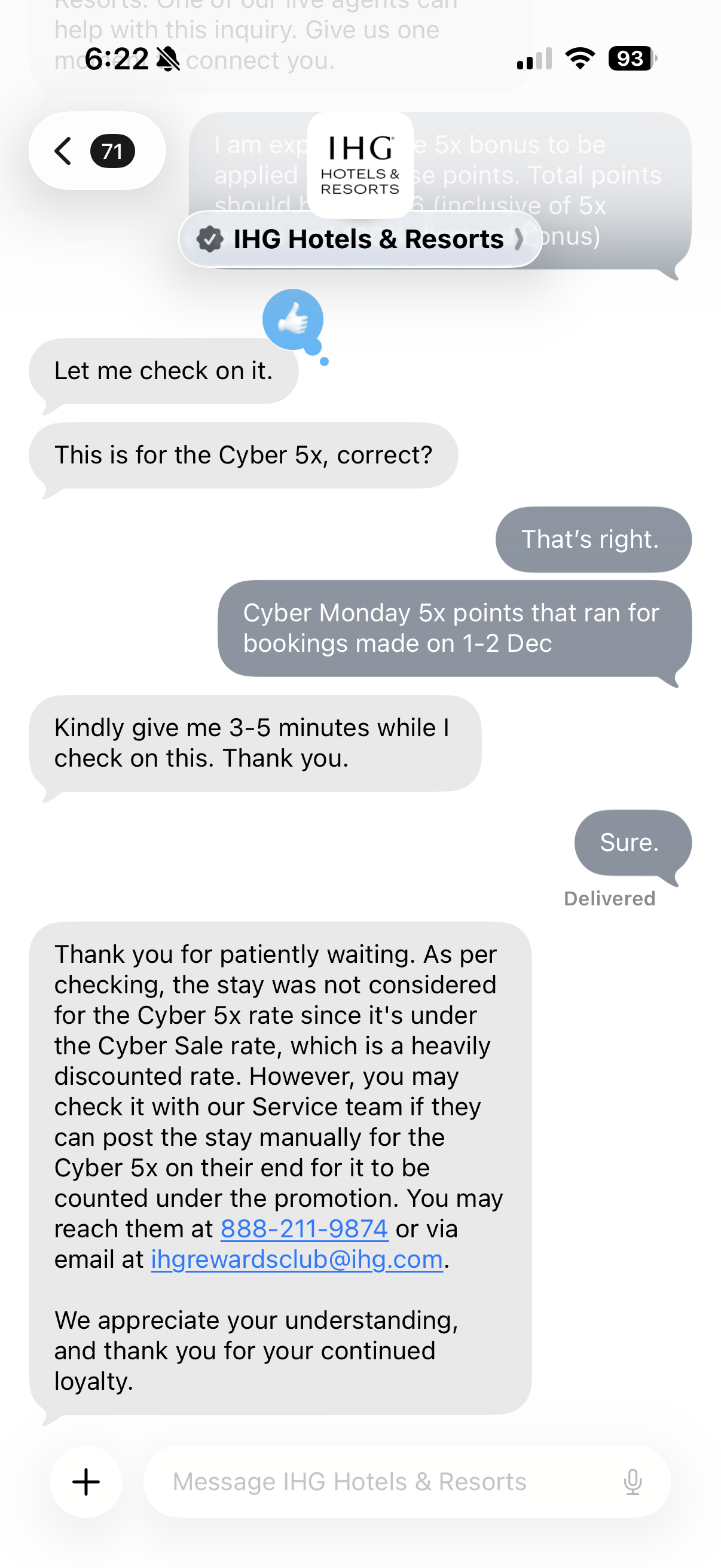 Escalate the Claim: If the initial agent gives you a scripted heavily discounted response, request a formal investigation. The Cyber Sale rates were explicitly eligible according to the marketing materials.The 5X points promotion was exceptionally generous, and for this stay, the difference in points is significant. It is worth the extra effort to ensure your account balance reflects what you earned.